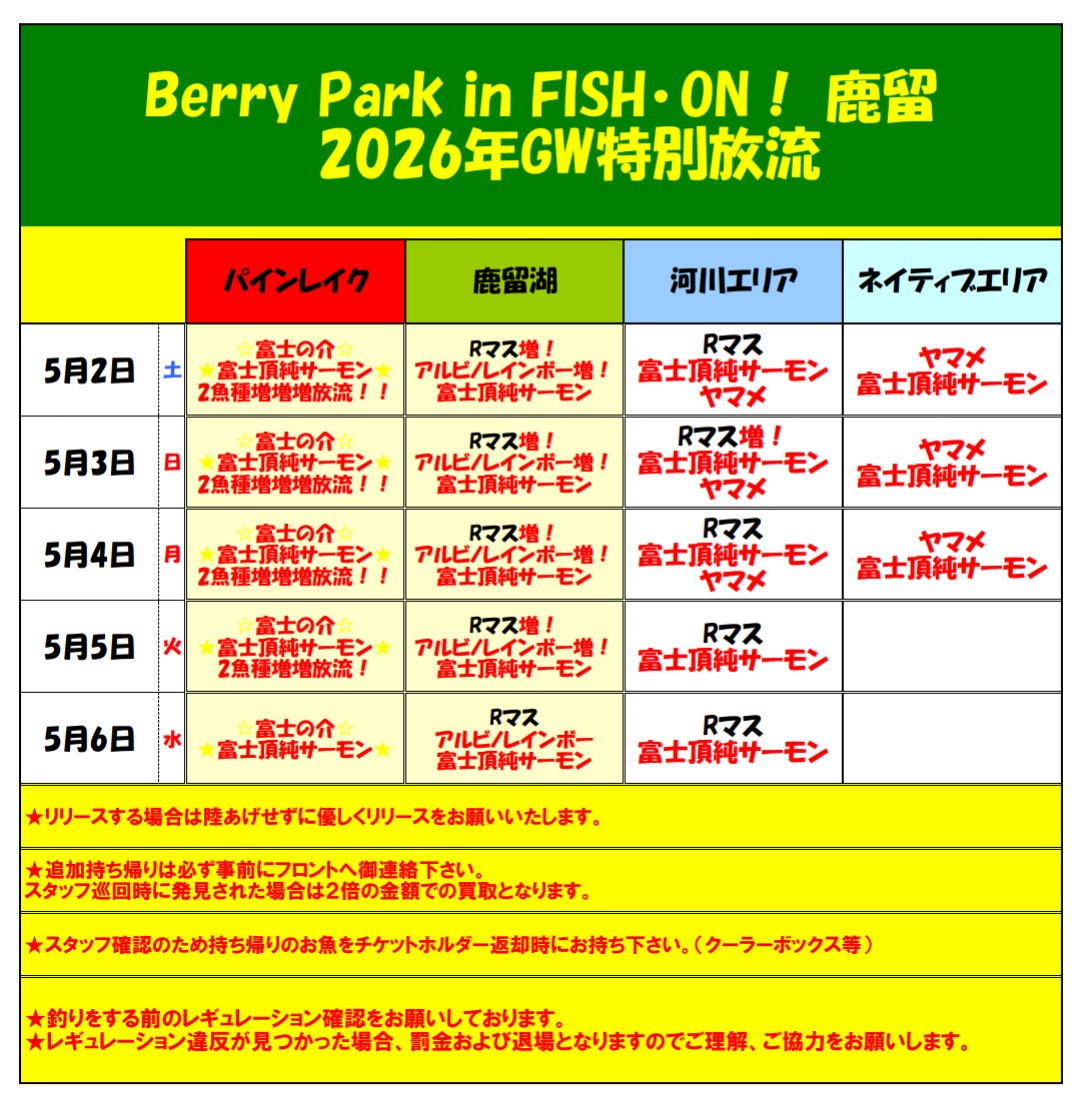 今年のGWは普段パインレイクに放流しているお魚『富士頂純サーモン』平均1.3kgを鹿留エリアにも放流いたします!!☆